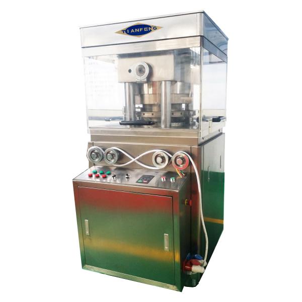 Combining ZP-23 25 27 rotary tablet press with electricity, equipped with touching key and screen. The first kind rotary tablet press is with semi-automatically lubricating equipment and Plexiglas anti-dust cover on the upper of revolving table.